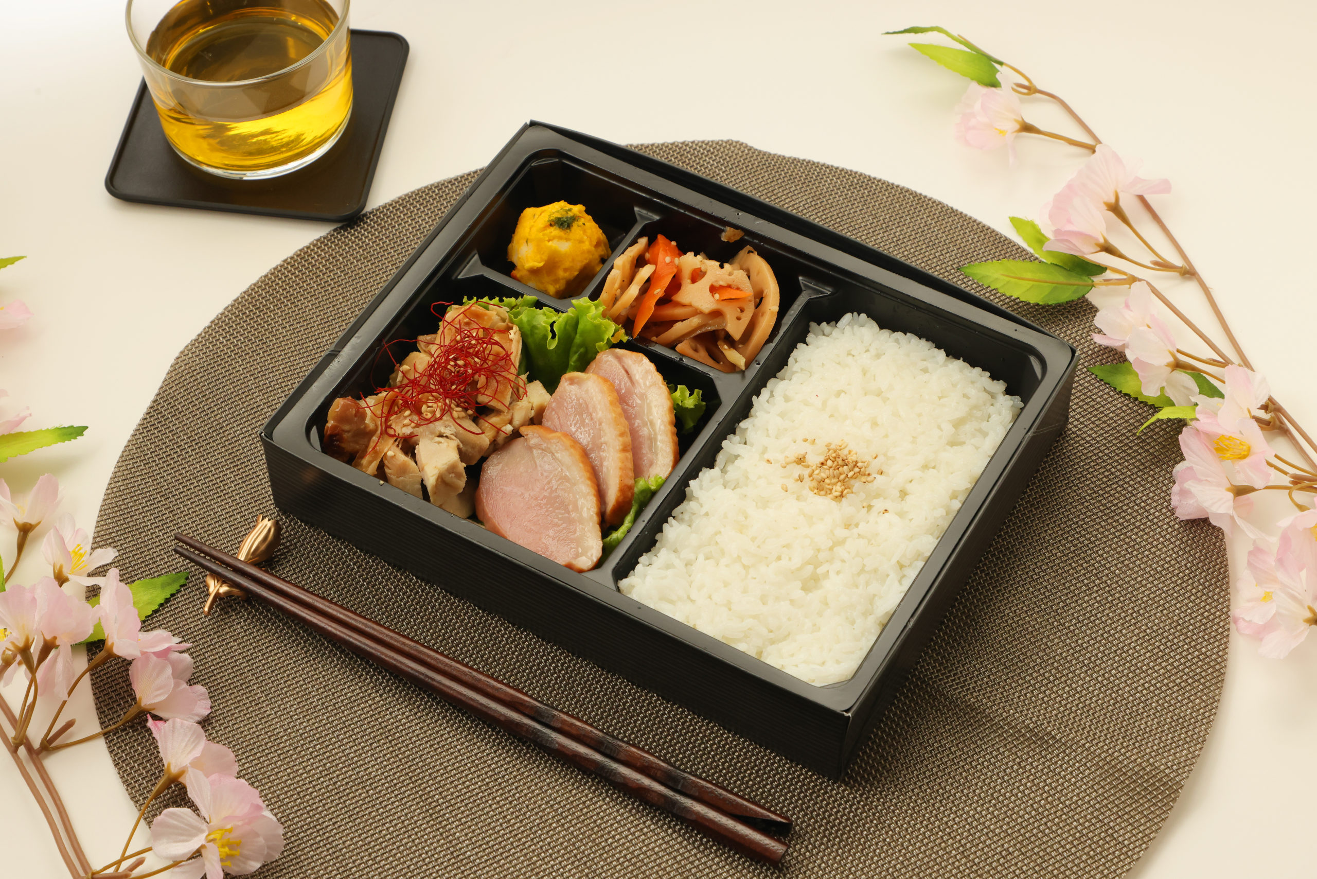 香ばしく焼き上げた鶏の幽庵焼きと、旨みたっぷりの鴨ロース、ほくほくのかぼちゃサラダを組み合わせた和の味わい弁当です。